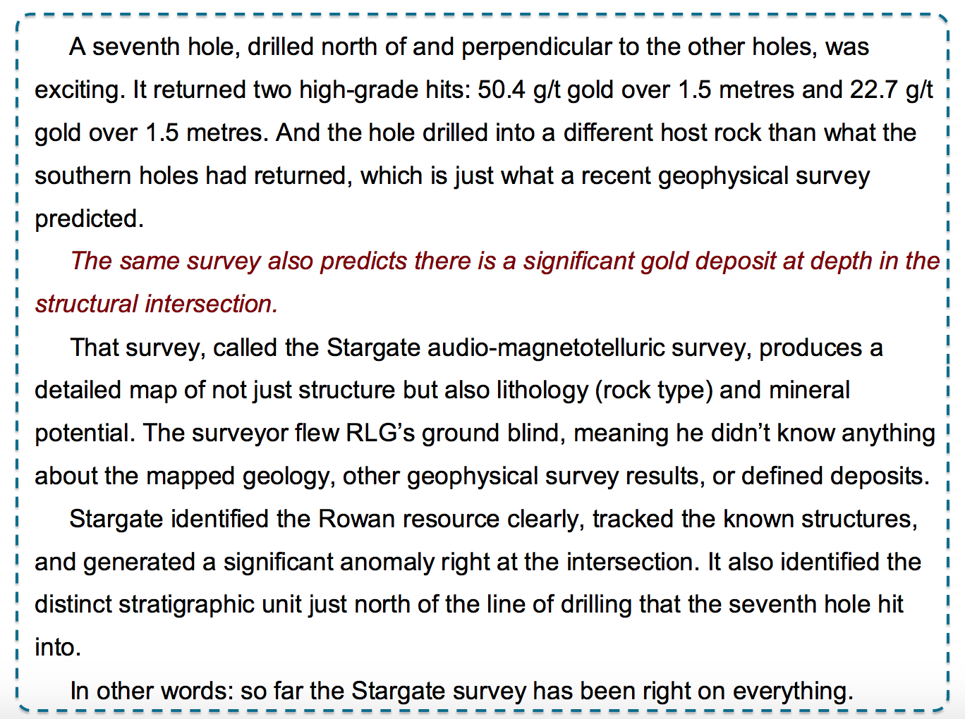Sept. 8, 2016 - The final drill hole, RLG-16-31, which contained the high grade gold, intersected a highly silicified, clastic/brecciated volcaniclastic unit. The alteration appears to be similar to the alteration in the NT Zone. This gold-bearing rock unit was identified and targeted by the SGII System provided by Earth Science Services Corp using Ultra-Sonic AMT technology.