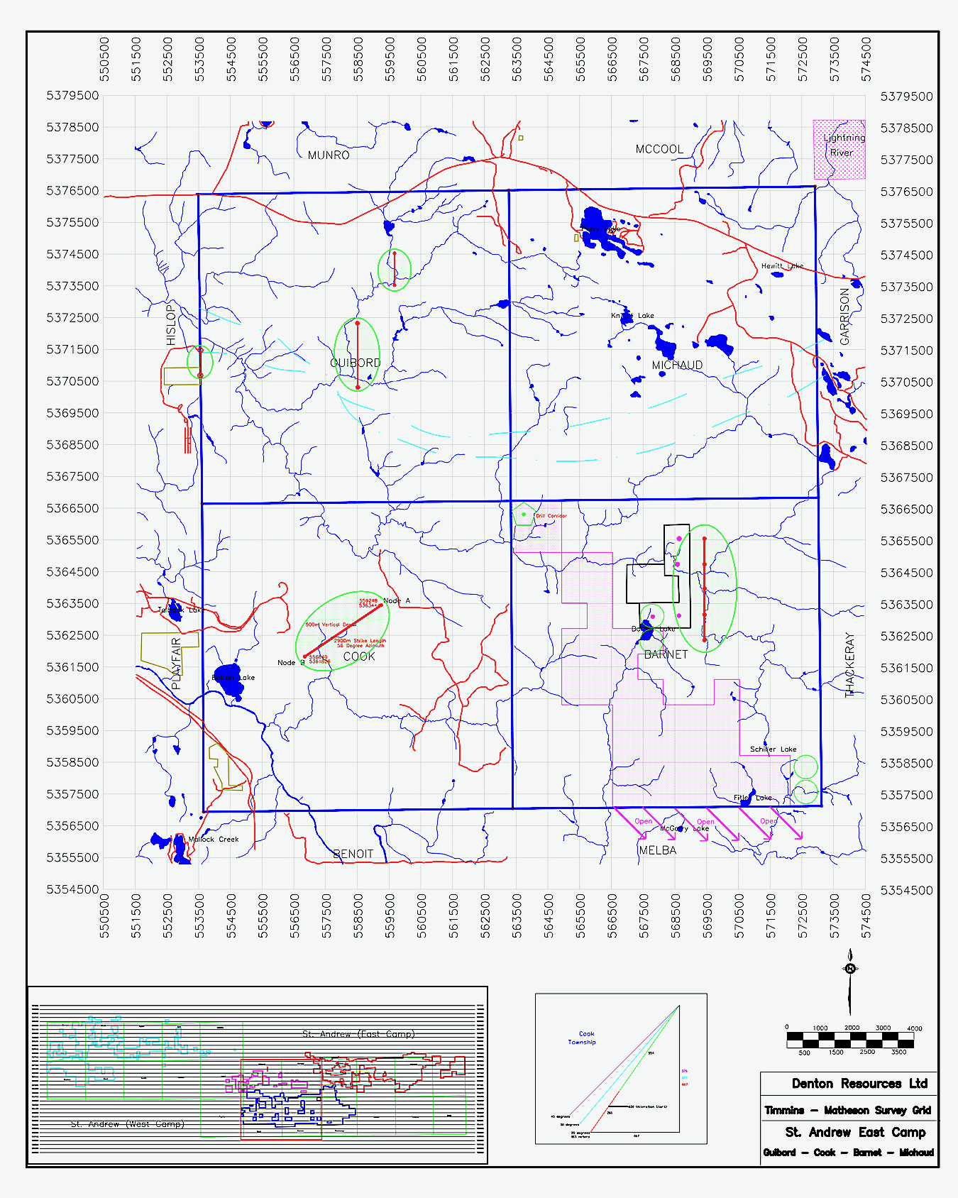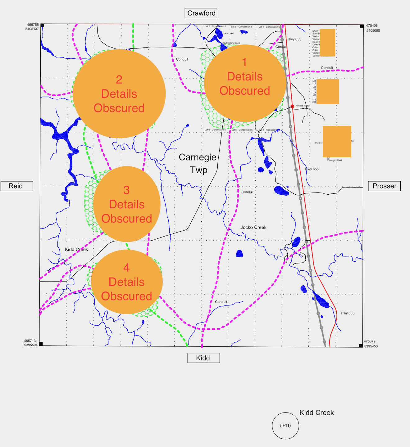 Note the proximity to the world's largest zinc mine -Kidd Creek, discovered in 1964, and in production ever since. For over 50 years, major mining companies and the best minds in the business have been studying this area, looking for another Kidd, to no avail. Many paper and theses have been written on this mine, explaining the orogenesis and geology, yet no sister mine has been found, and the Kidd Mine is scheduled to shut down in 2022.