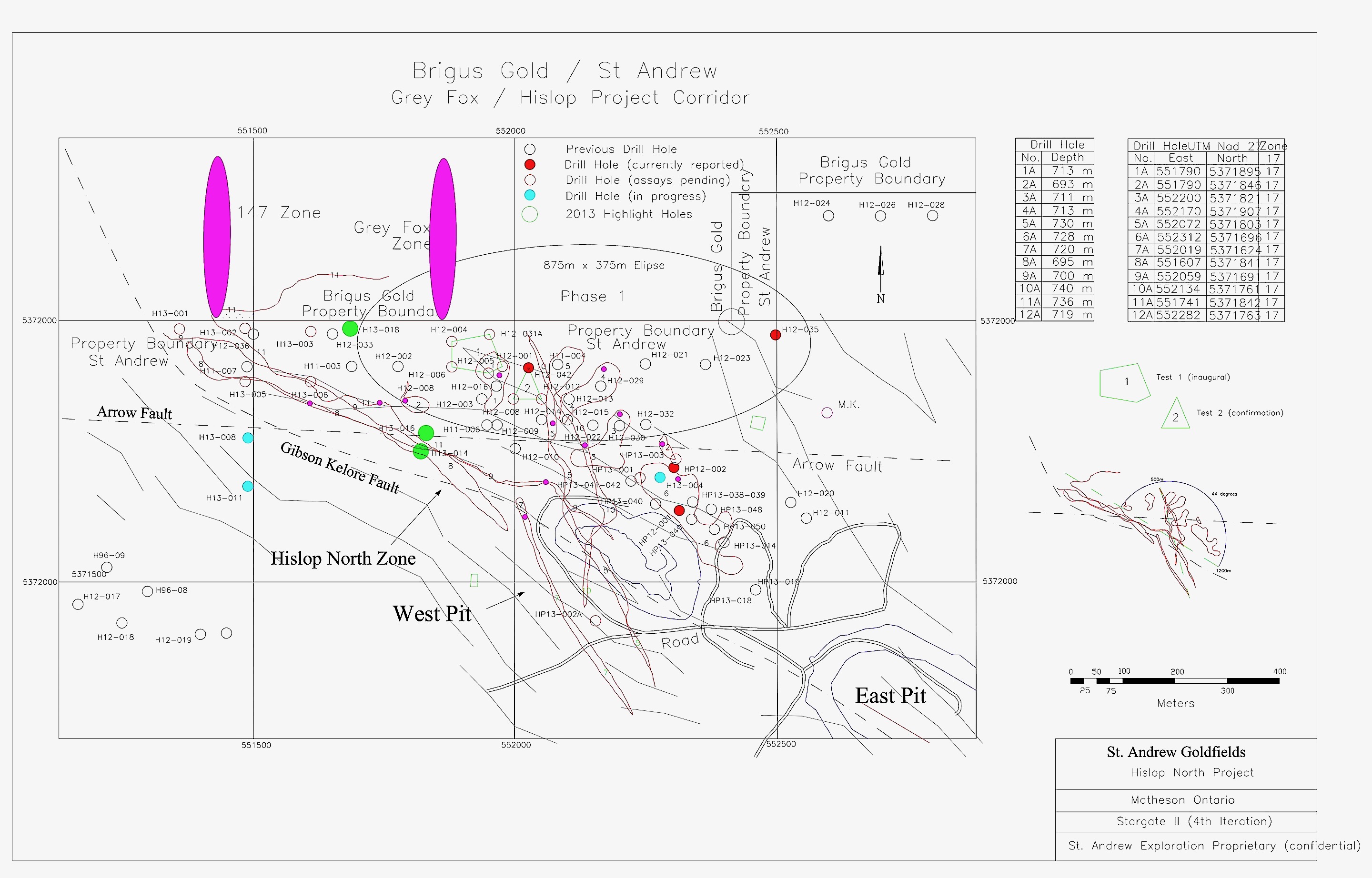 Hislop Township - One of the first test holes in Ontario by a public issuer using SGII was undertaken by SAS on their Hislop North (147 zone). It was a deep vertical hole to test for the extension of the adjacent Primero Gold 147 zone.