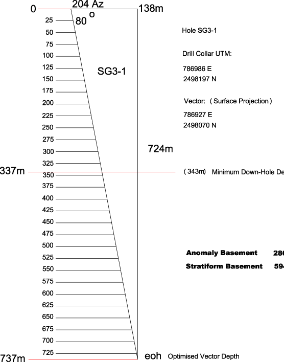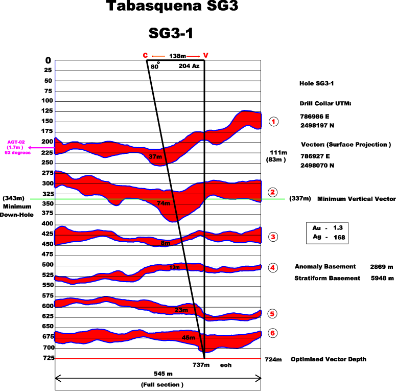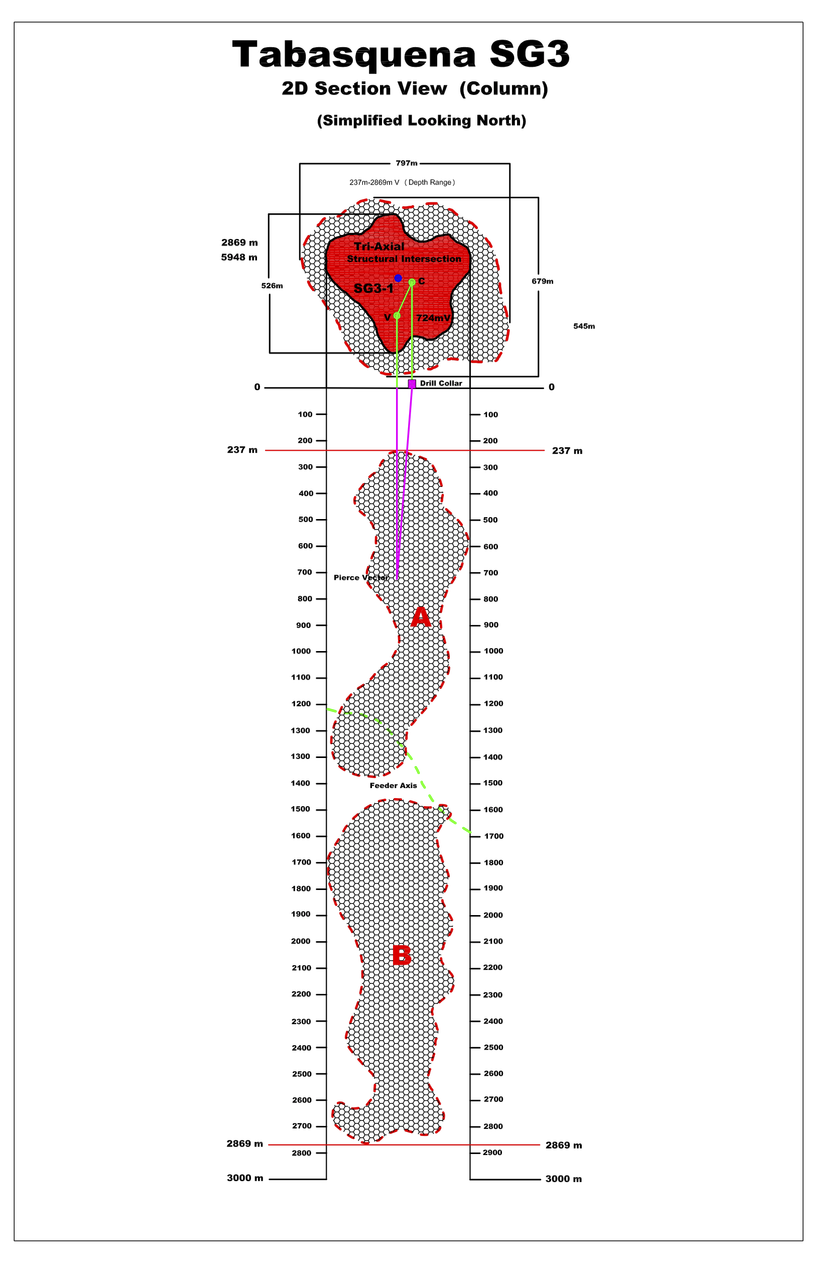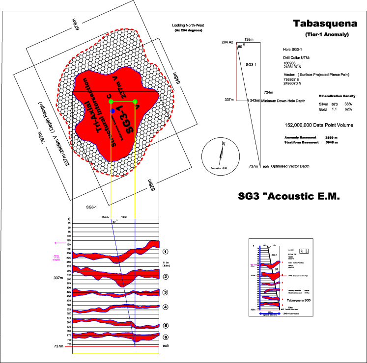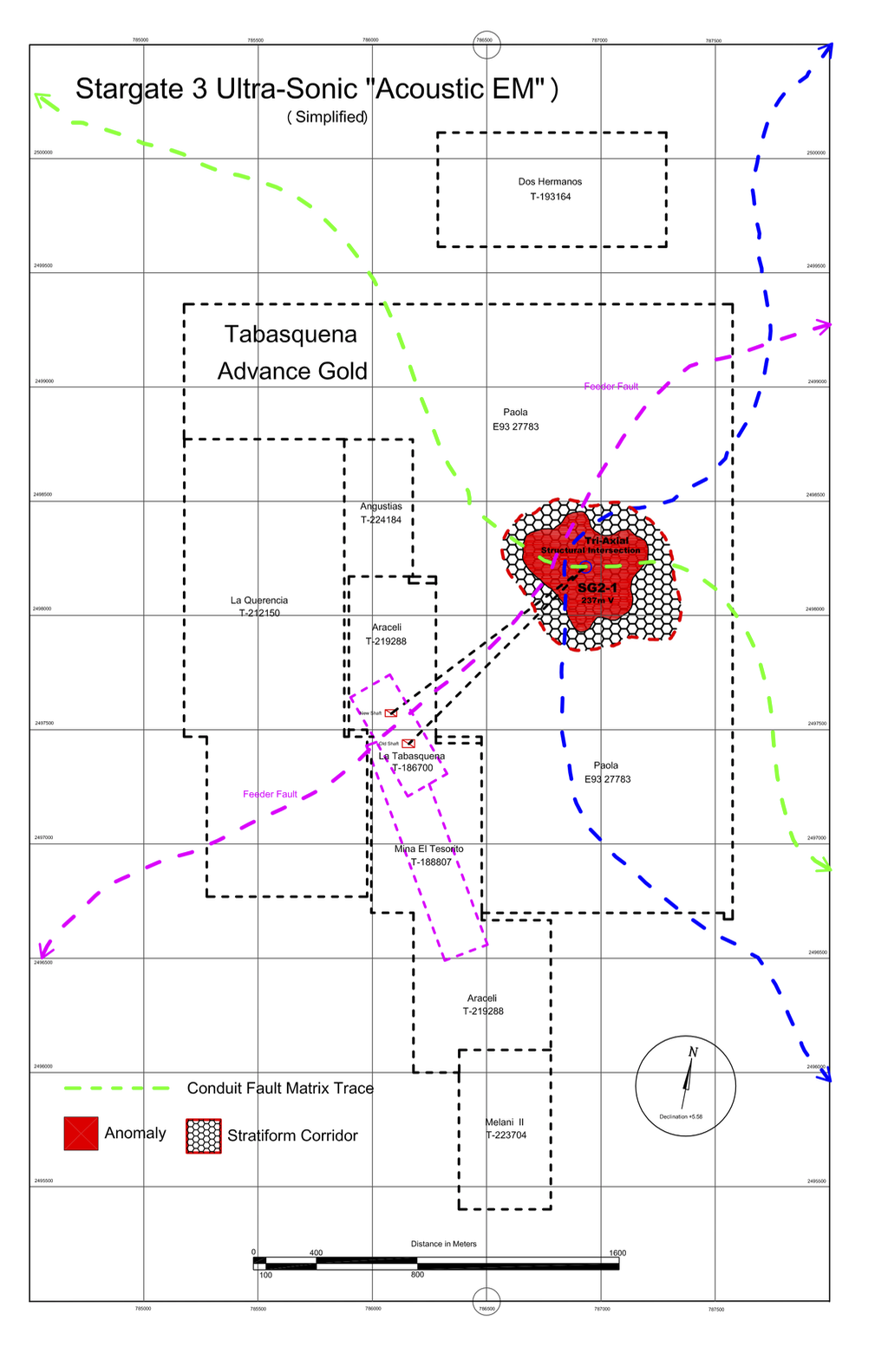 From its database from earlier area surveys, the Stargate 3 technology identified the principal structural traces (mineral feeder system/ faults) on the Tabasquena claims. This interpretation confirms the company's current exploration work, and in addition SG3 is capable of providing data to great depths- in this case to 2800m.
