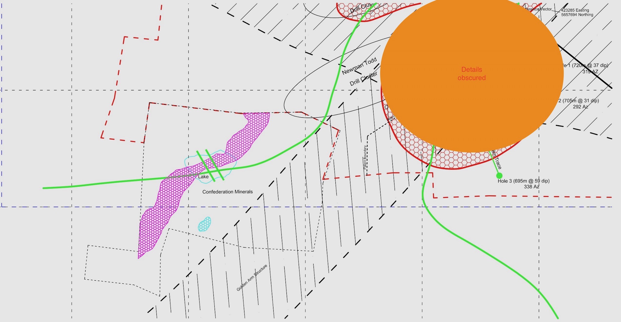 The initial hole will be drilled from southeast to the northwest into the Golden Arm Structure to test the area of mafic-ultramafic contact identified as an exploration target by the underlying geology and an AMT geophysical survey. (by ESSCO).