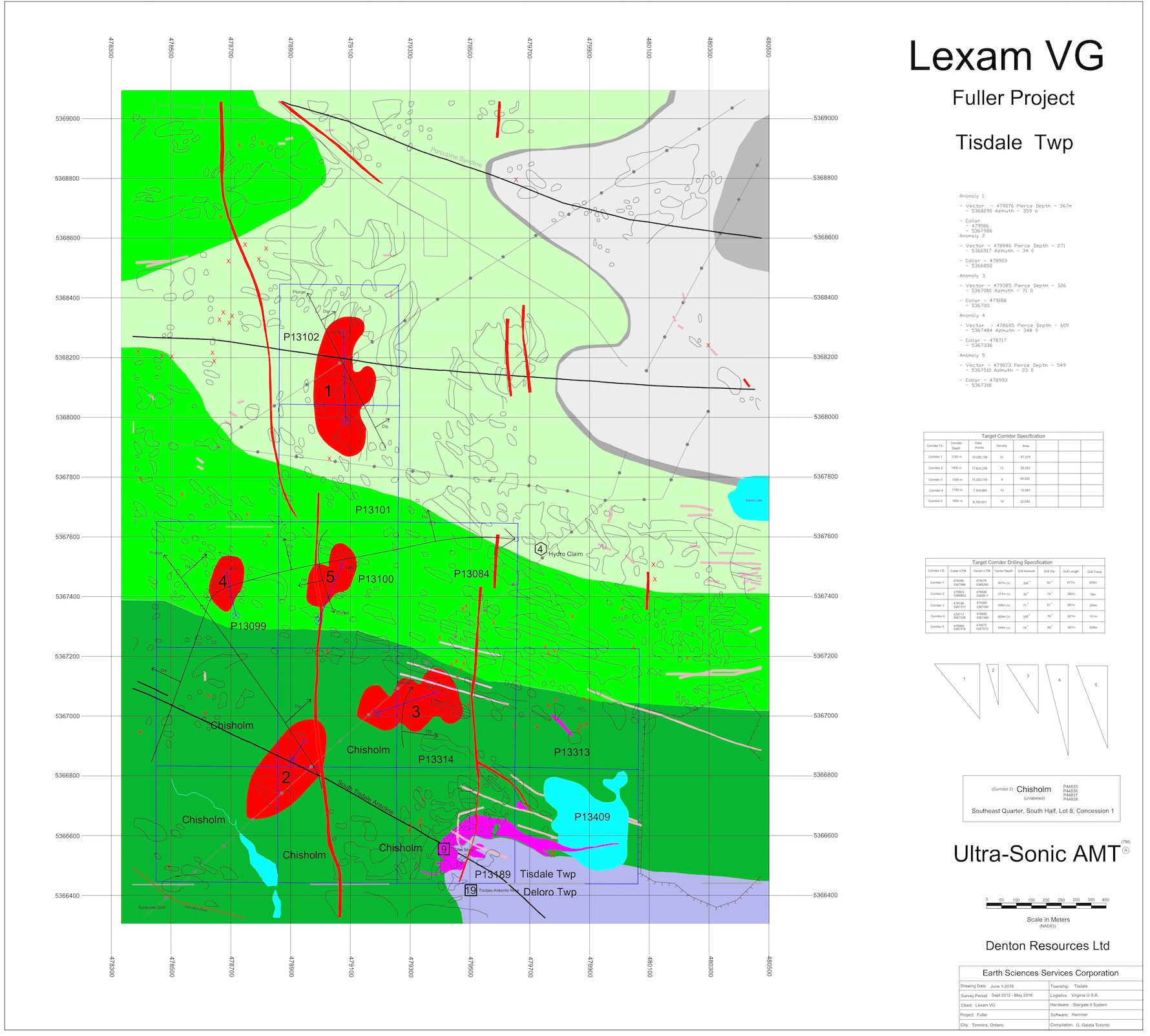 In June, 2016, ESSCO provided a map outline of its interpreted anomalies on the Fuller property, adjacent to the Hollinger Mine. Proposed drill targets with vectors and pierce point data are available.