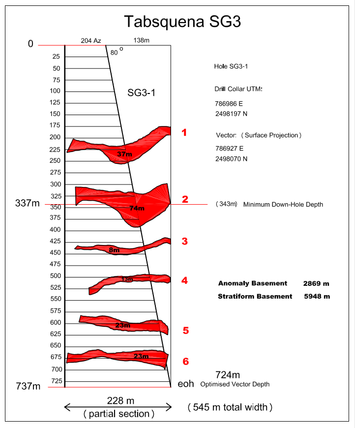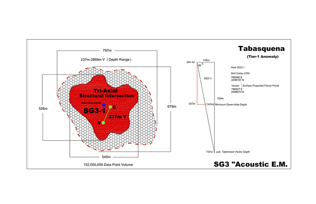 From its database from earlier area surveys, the Stargate 3 technology identified the principal structural traces (mineral feeder system/ faults) on the Tabasquena claims. This interpretation confirms the company's current exploration work, and in addition SG3 is capable of providing data to great depths- in this case to 2800m.