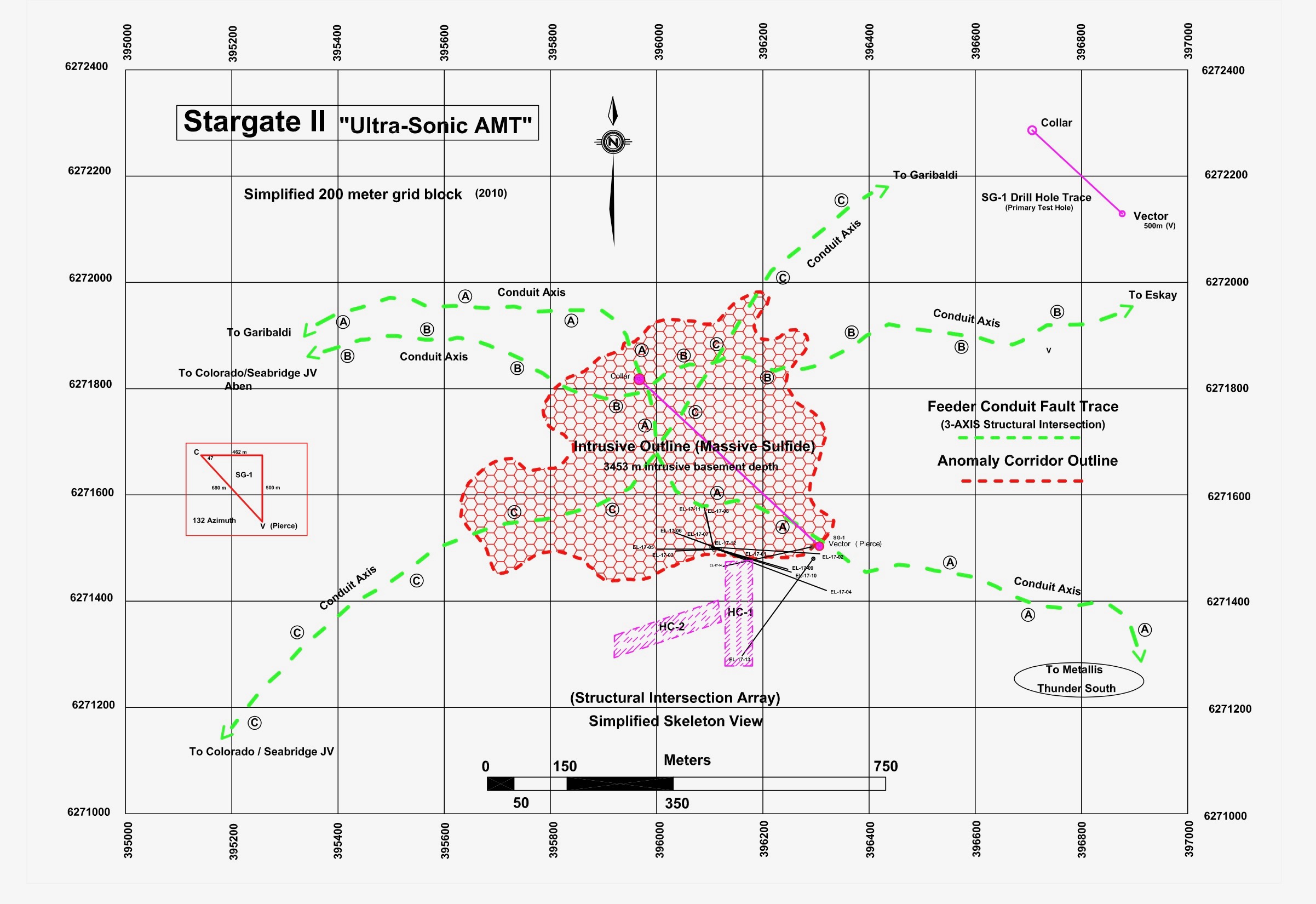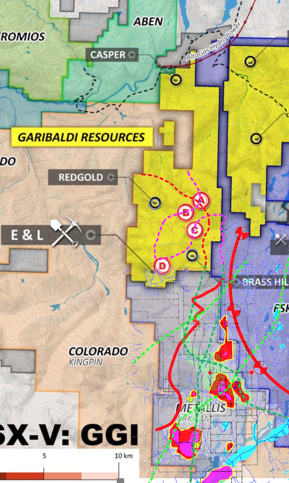 The positive Eskay Mining result returns which we modelled after the Eskay Creek deposit setting, were the primary reason why we associatively interpreted the Garibaldi and Metallis environments as being so important.  3 very prominent Stargate II anomalies (2 to 3 times larger than the Eskay Creek system) are located along the west Eskay Rift contact which lays within 500 meters of both the GGI and MTS eastern property borders. On the illustration, Eskay targets 1 through 3 are referenced by the thick red line arc which correlates with the Eskay Rift curve. In essence, we interpret that a repeat of the Eskay Rift occurs within both Garibaldi and Metallis holdings.